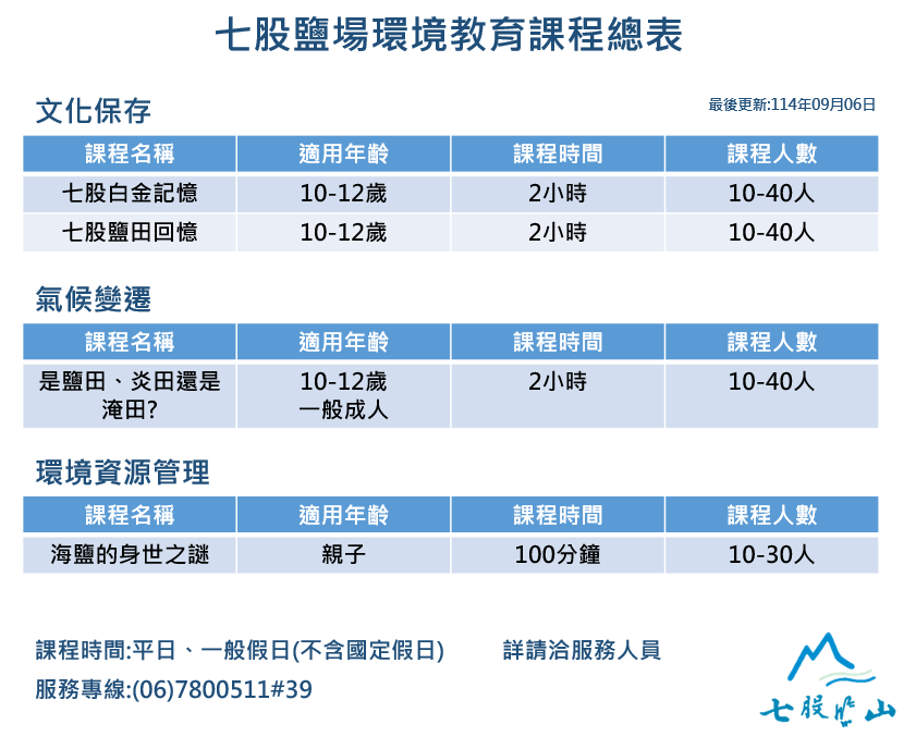 七股鹽場於112年3月1日正式取得環境教育場所認證,現階段有4個環境教育課程供選擇,分別為七股白金記憶、七股鹽田回憶以及是鹽田、炎田還是淹田,海鹽的身世之謎,可預約時段為平日、一般假日(不含國定假日),詳請洽服務人員,服務專線:(06)7800511#39。